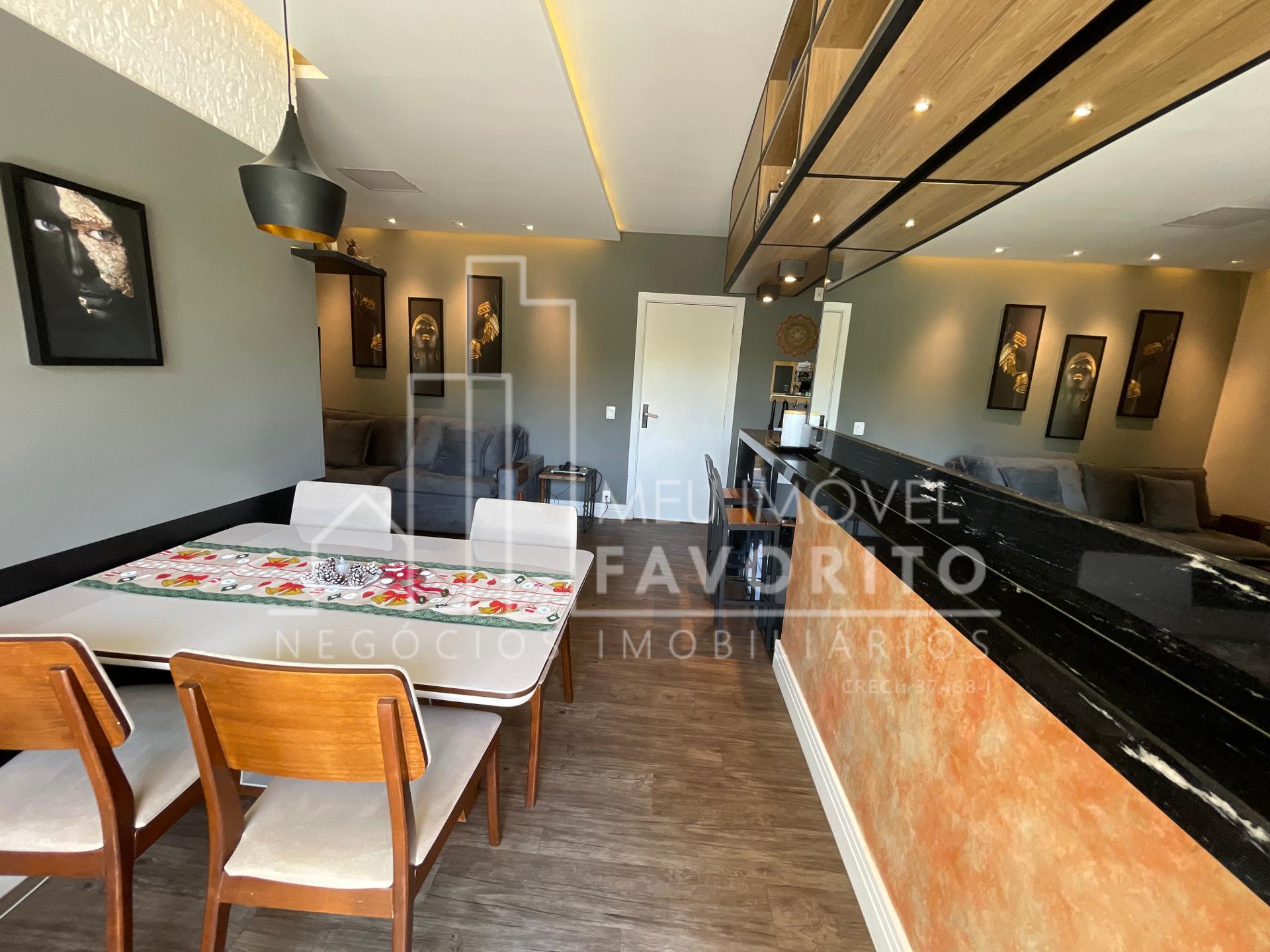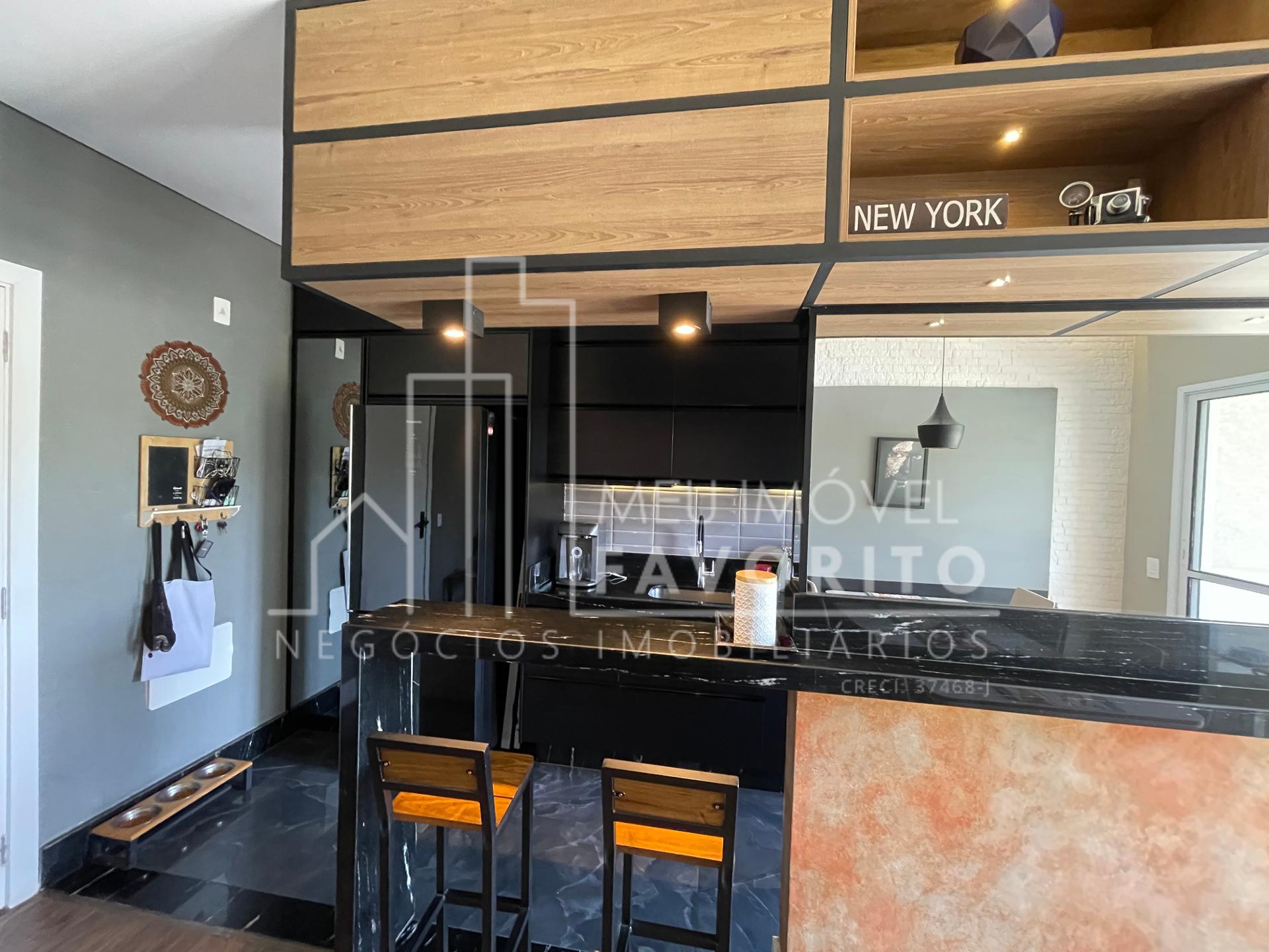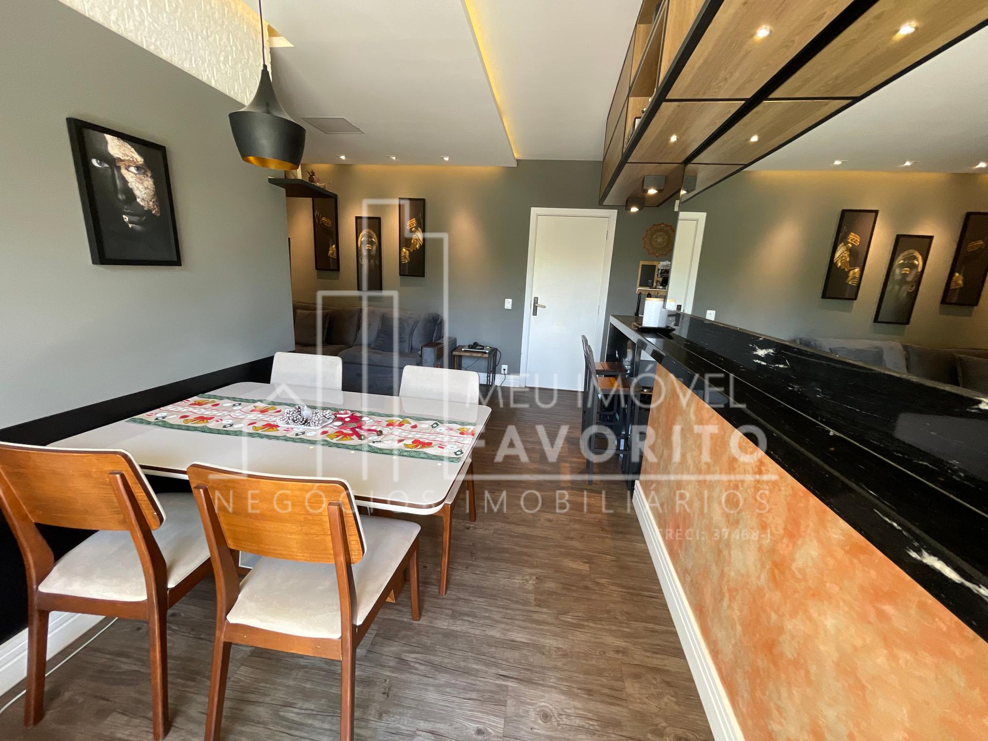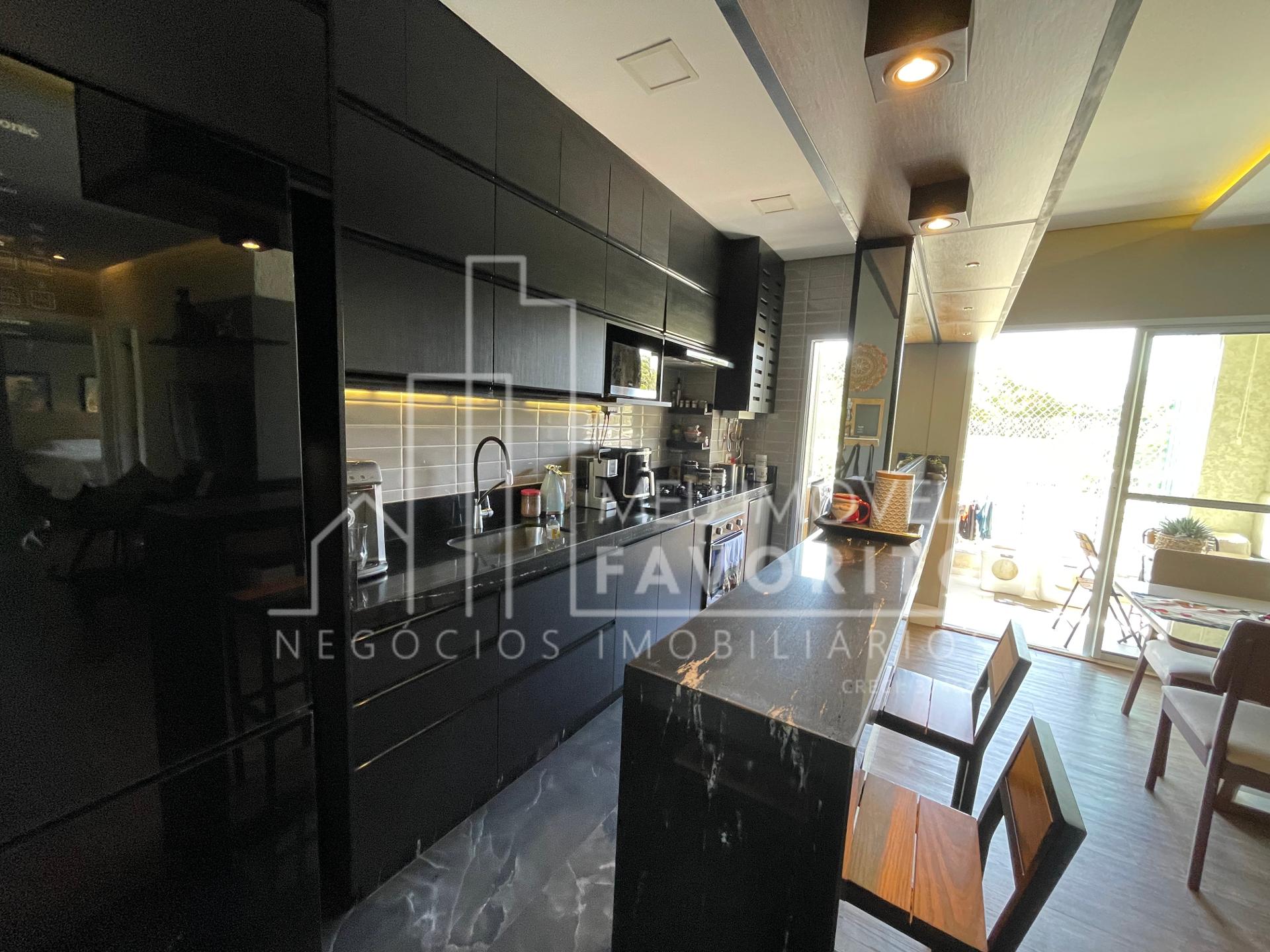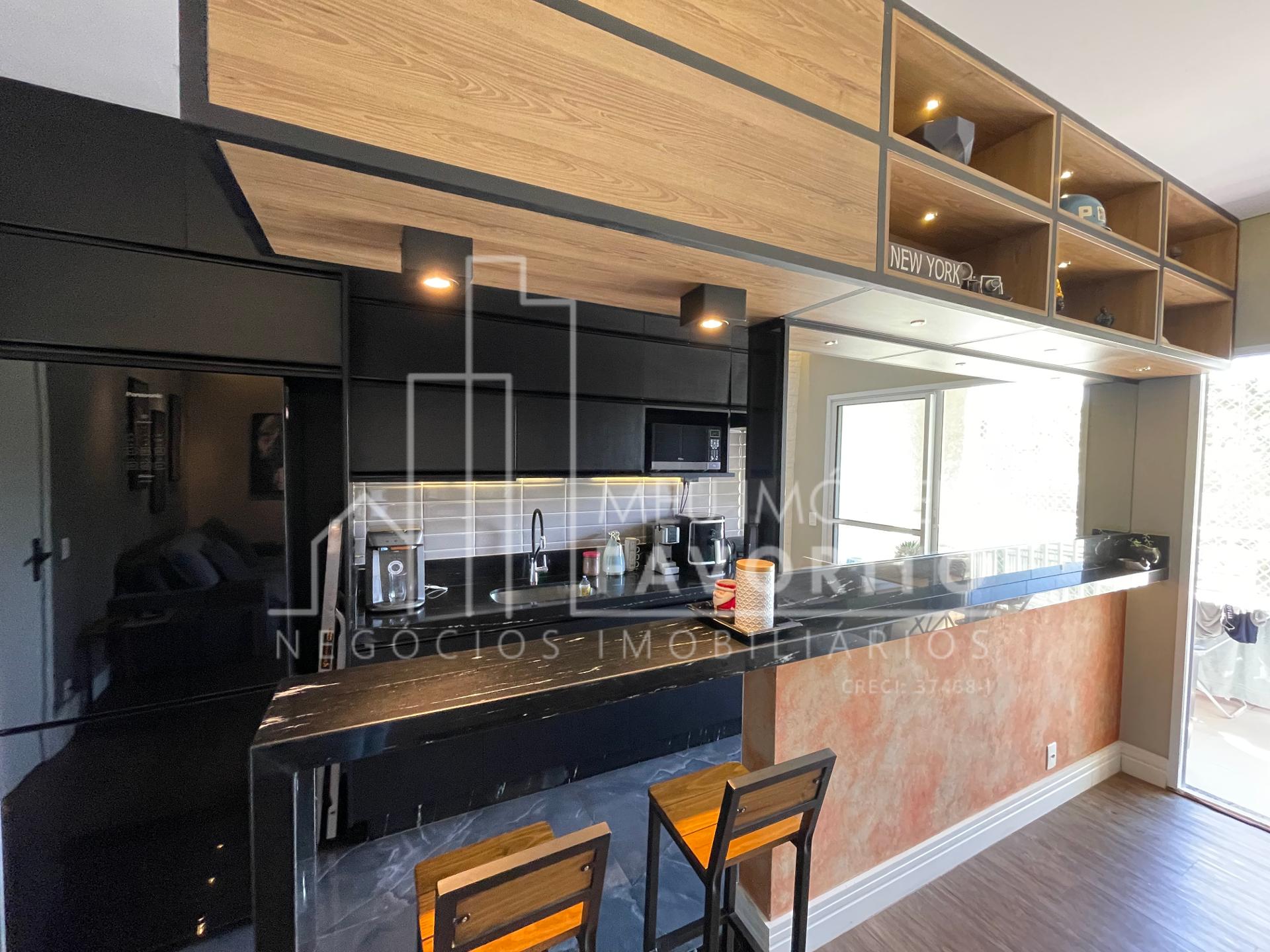 Apartamento com 2 dormitórios sendo 1 suíte, 68m², cozinha toda planejada com um tom mais escuro, coifa e forno ja embutidos, sala de estar e jantar integradas, sacadas com fechamento em vidro, espaço do garden fechado por telinha, suíte com planejado no quarto e no banheiro.