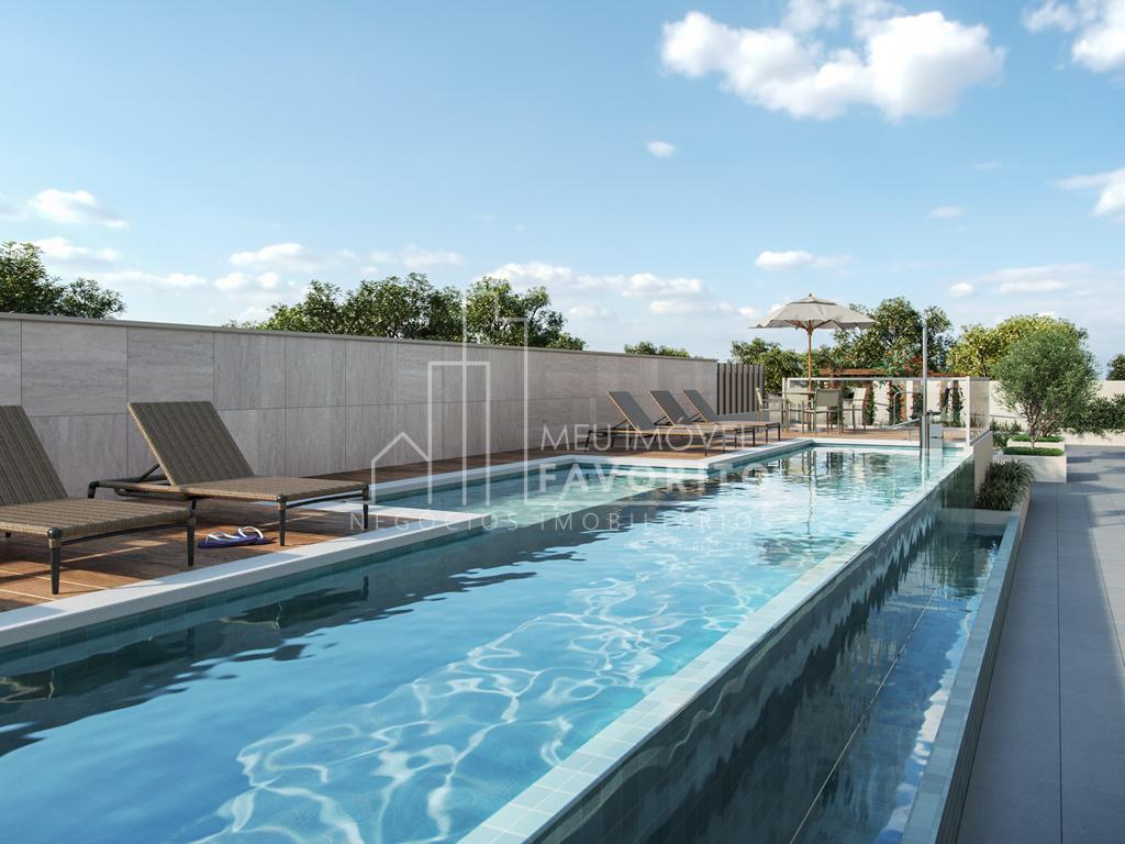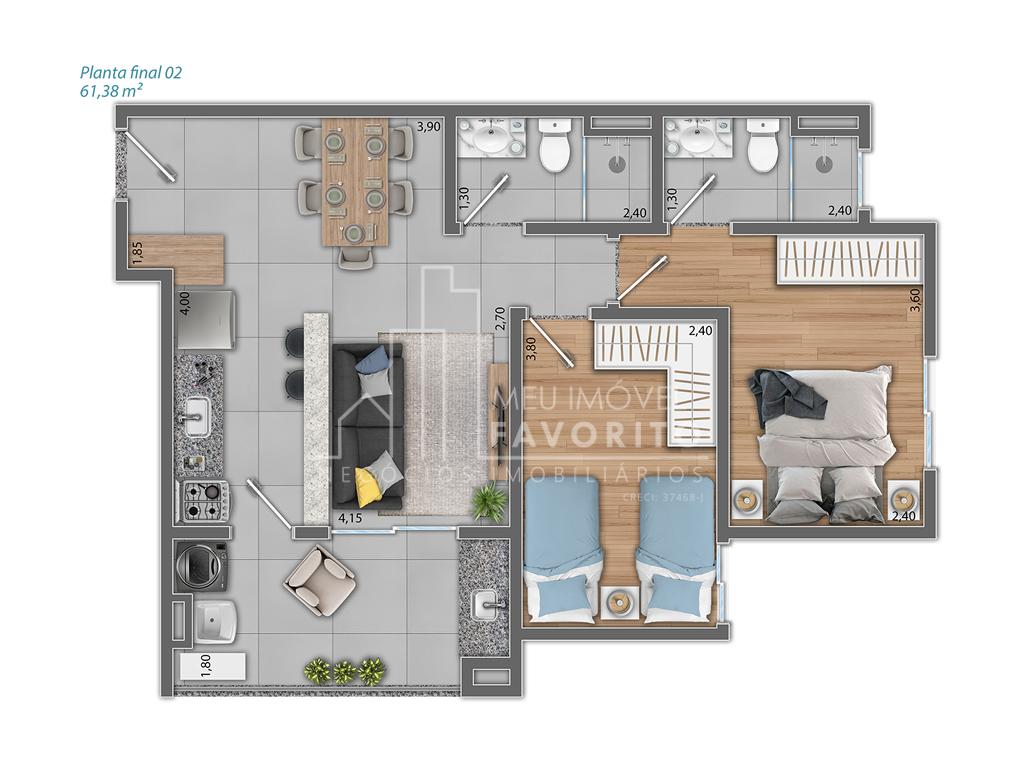Apartamento com varanda gourmet, planta de 61,38m², com 2 dormitórios, sendo 1 suíte e 1 vaga de garagem.
