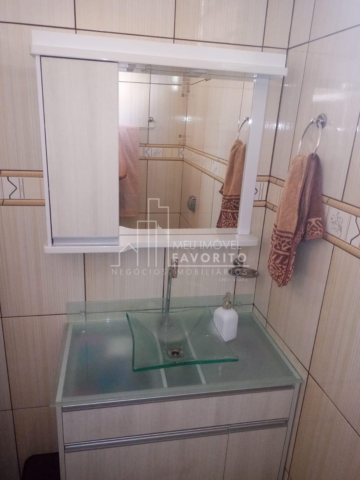 Casa com 3 dormitórios, 1 banheiro com box e armarinho, cozinha com armários.
