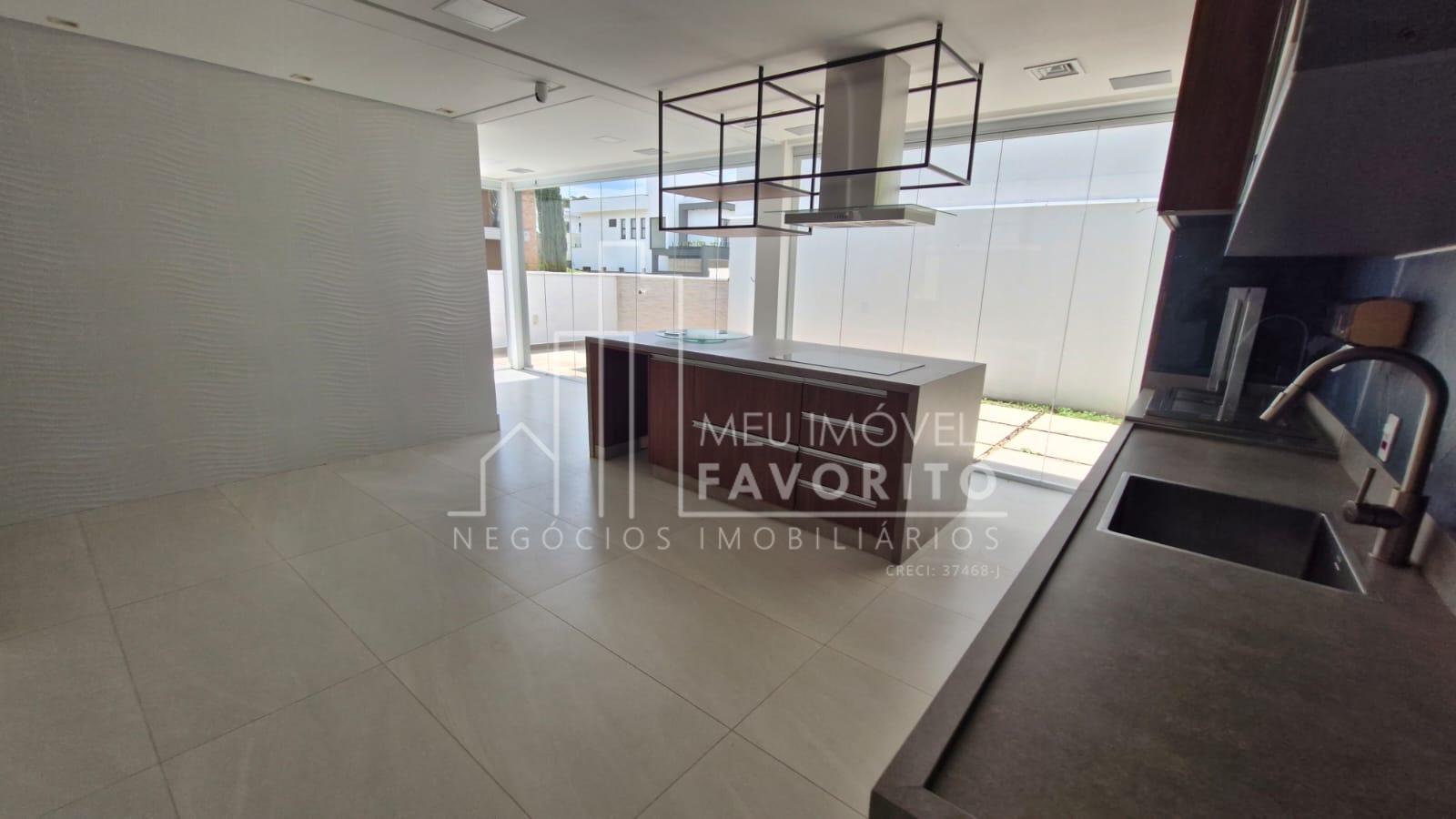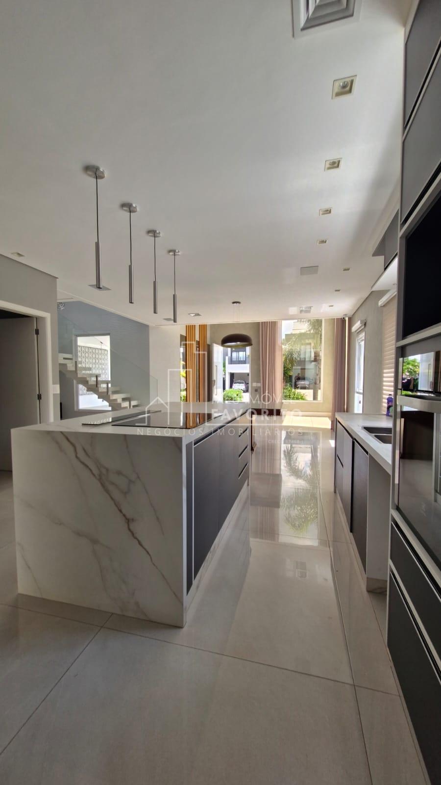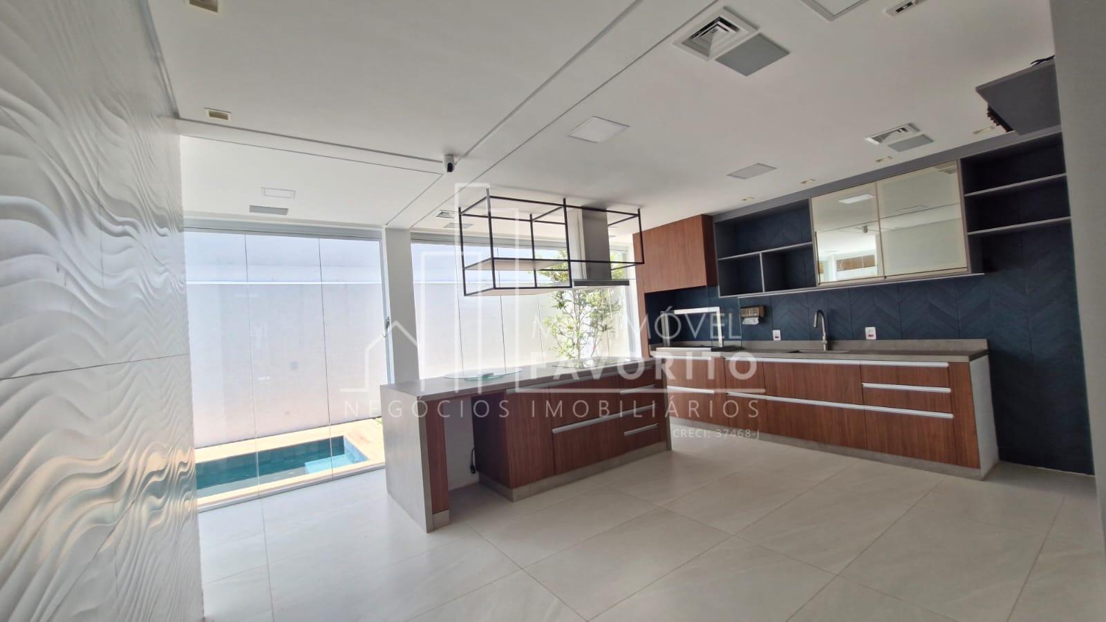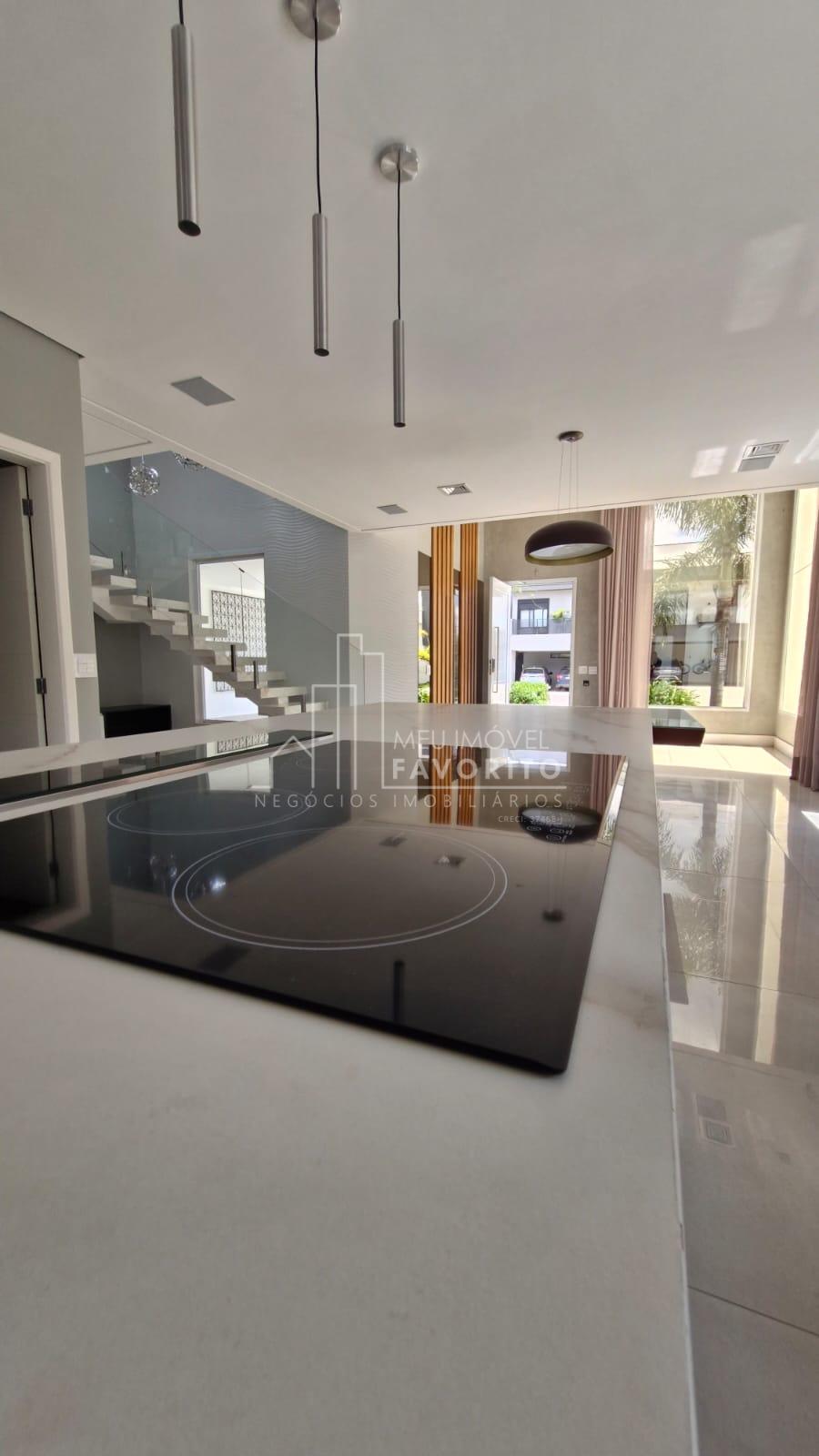 A cozinha é moderna e funcional, equipada com ilha central com fogão de indução, coifa embutida com aspiração perimetral, forno embutido e acabamentos de alto padrão. No piso térreo, o imóvel conta ainda com uma suíte, lavanderia e ambientes planejados para praticidade e conforto.