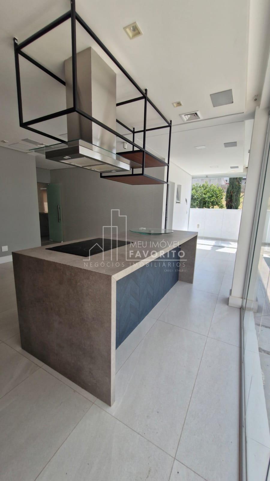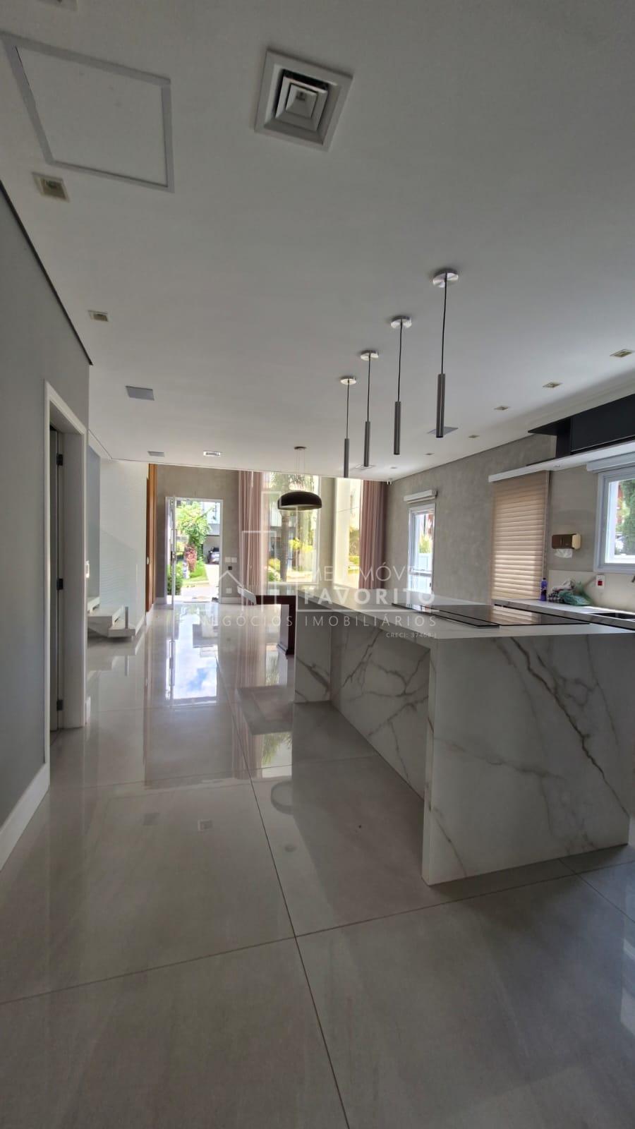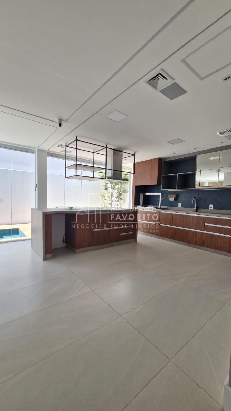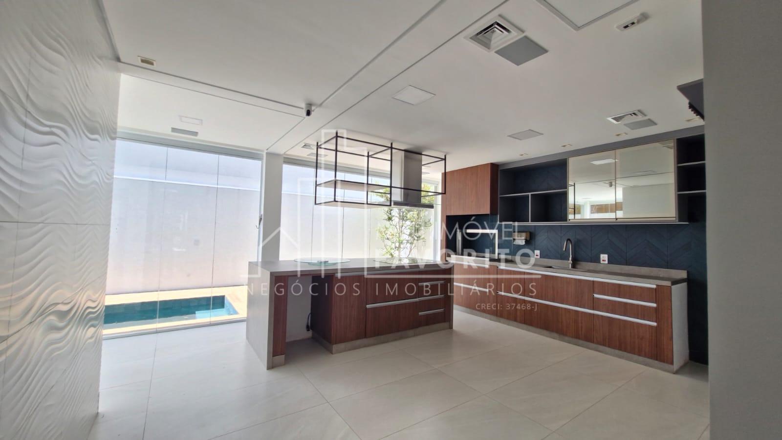 A cozinha é moderna e funcional, equipada com ilha central com fogão de indução, coifa embutida com aspiração perimetral, forno embutido e acabamentos de alto padrão. No piso térreo, o imóvel conta ainda com uma suíte, lavanderia e ambientes planejados para praticidade e conforto.