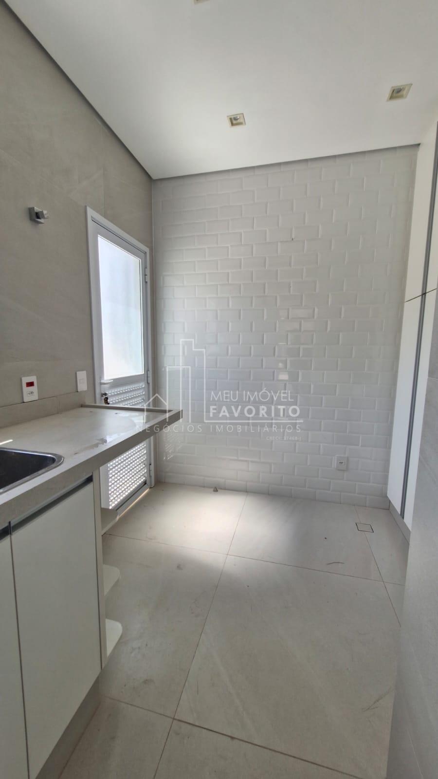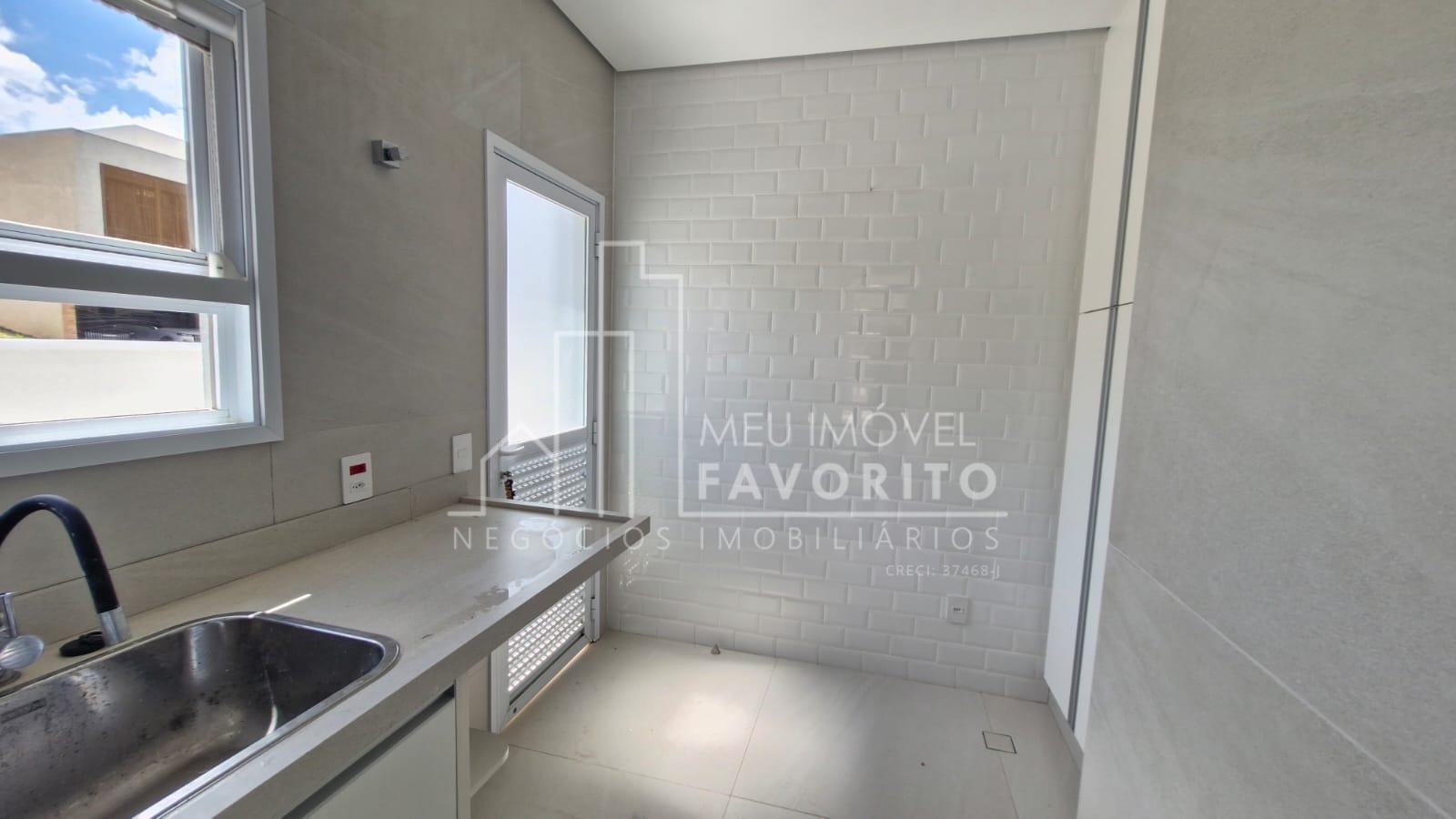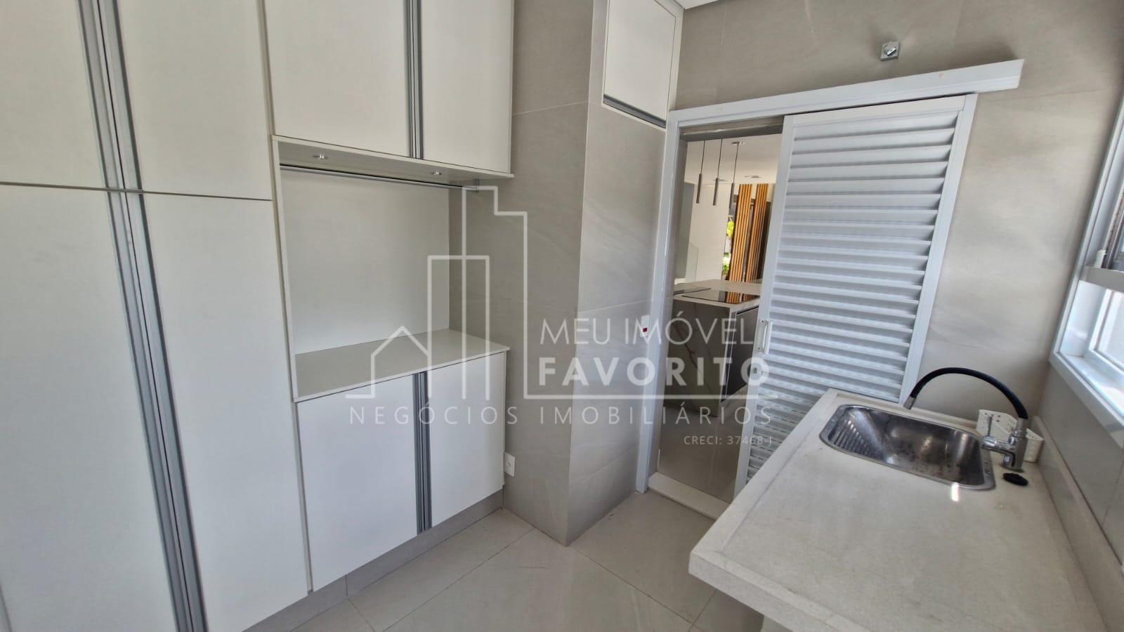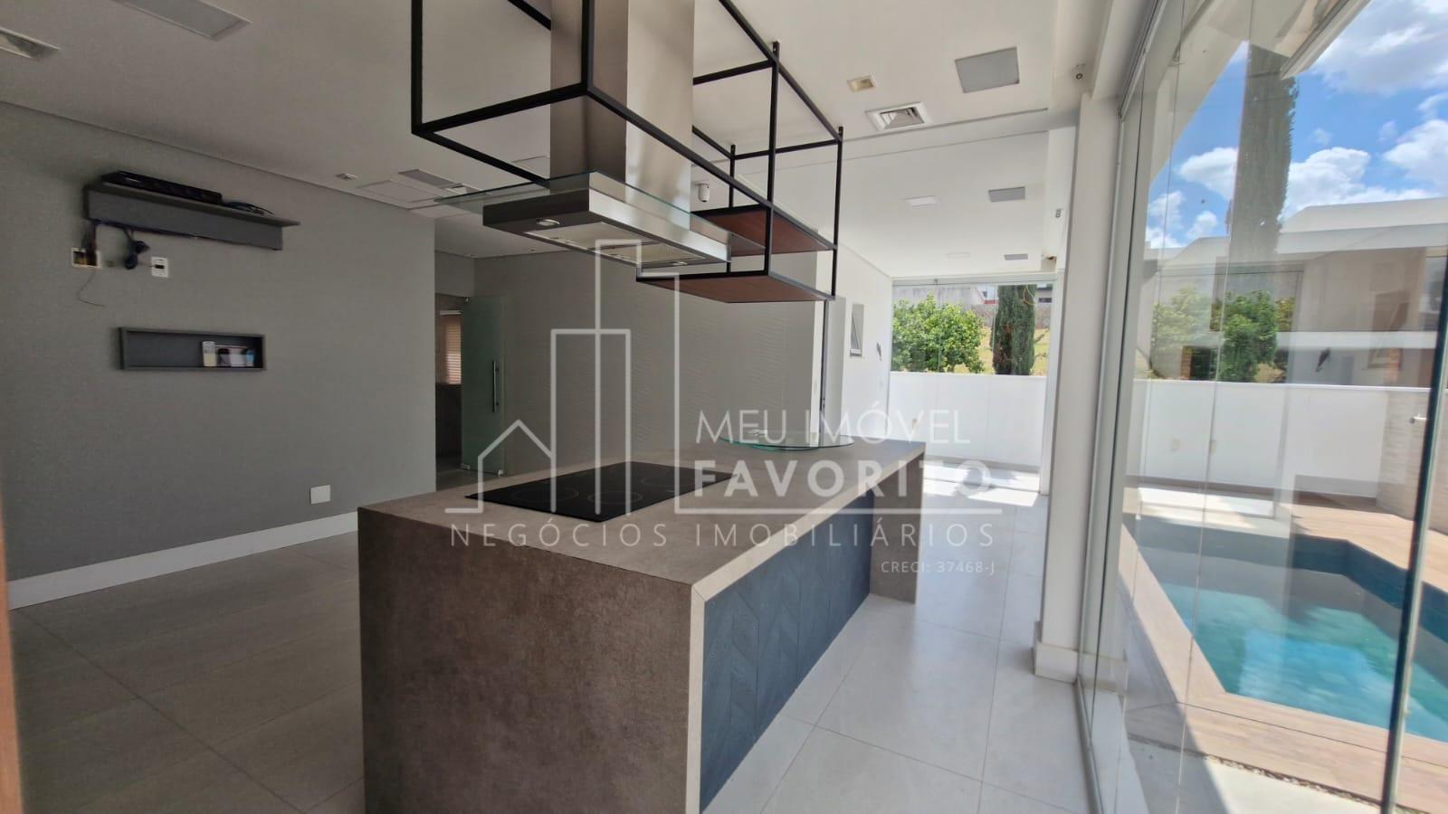 A cozinha é moderna e funcional, equipada com ilha central com fogão de indução, coifa embutida com aspiração perimetral, forno embutido e acabamentos de alto padrão. No piso térreo, o imóvel conta ainda com uma suíte, lavanderia e ambientes planejados para praticidade e conforto.